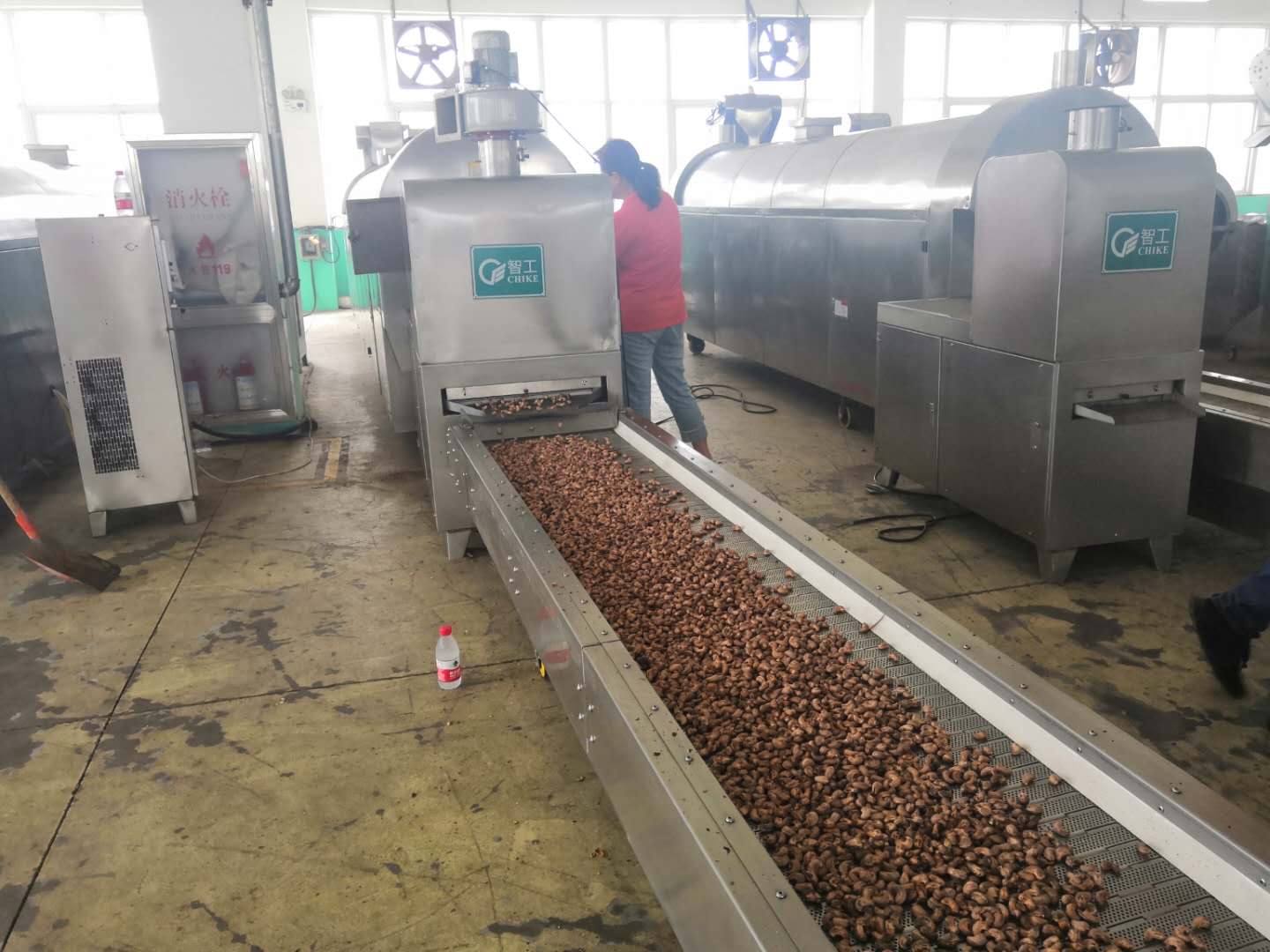 6月19日,山东客户自带腰果到许昌智工试机6米流水线电磁炒货机。