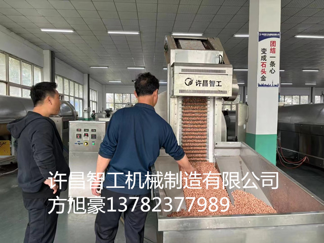 2024年4月9日,河南开封客户一行三人,带200斤腌制好的五香花生米来厂试机八米电磁流水线炒制。 许昌智工八米电磁流水线智能化控制,无需人工看管,炒出产品均匀一致。客户非常认可