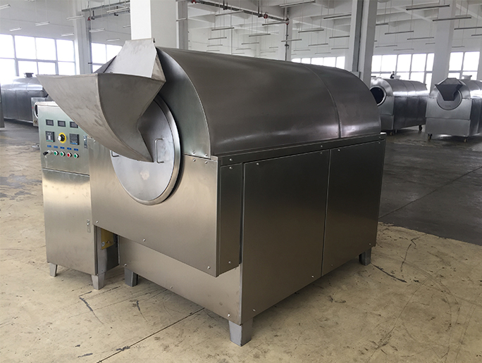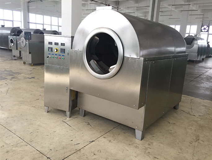 该机型炒花生果一锅90公斤左右 炒花生米一锅150公斤左右 属于中大型单锅滚筒炒花生机 电磁加热智能控温 节能环保无碳排放的滚筒炒花生机